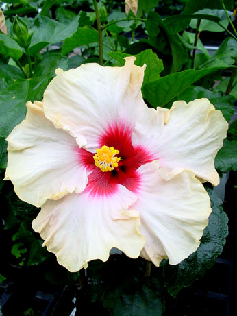 Kleur : creme met rood oog Bloemvorm : enkel Bloemgrootte : 21 cm Familie : Malvaceae Standplaats : Zon Overwinteringstemperatuur : 15 °C Bloeiperiode : April-november Opmerkingen : -