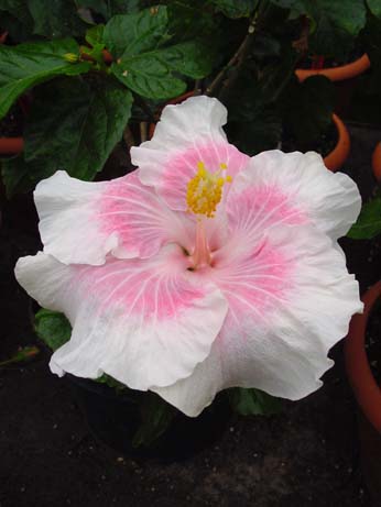 Kleur : rose met witte rand Bloemvorm : enkel Bloemgrootte : 15 cm Familie : Malvaceae Standplaats : Zon Overwinteringstemperatuur : 15 °C Bloeiperiode : April-november Opmerkingen : -