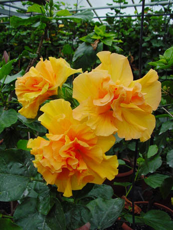 Kleur : geel/oranje Bloemvorm : dubbel Bloemgrootte : 13 cm Familie : Malvaceae Standplaats : Zon Overwinteringstemperatuur : 15 °C Bloeiperiode : April-november Opmerkingen : -