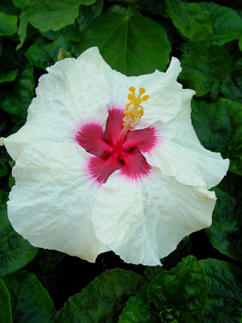Kleur : wit met donkerrood oog Bloemvorm : enkel Bloemgrootte : 18 cm Familie : Malvaceae Standplaats : Zon Overwinteringstemperatuur : 15 °C Bloeiperiode : April-november Opmerkingen : -