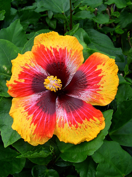 Kleur : oranje met gele rand en donker oog Bloemvorm : enkel Bloemgrootte : 24 cm Familie : Malvaceae Standplaats : Zon Overwinteringstemperatuur : 15 °C Bloeiperiode : April-november Opmerkingen : -