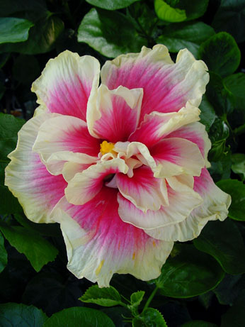 Kleur : cerise met witte rand Bloemvorm : dubbel Bloemgrootte : 18 cm Familie : Malvaceae Standplaats : Zon Overwinteringstemperatuur : 15 °C Bloeiperiode : April-november Opmerkingen : -