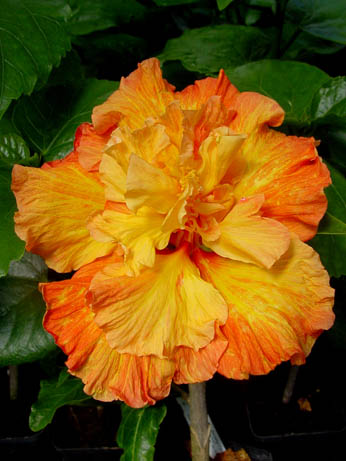 Kleur : oranje gevlamd Bloemvorm : halfdubbel Bloemgrootte : 20 cm Familie : Malvaceae Standplaats : Zon Overwinteringstemperatuur : 15 °C Bloeiperiode : April-november Opmerkingen : -