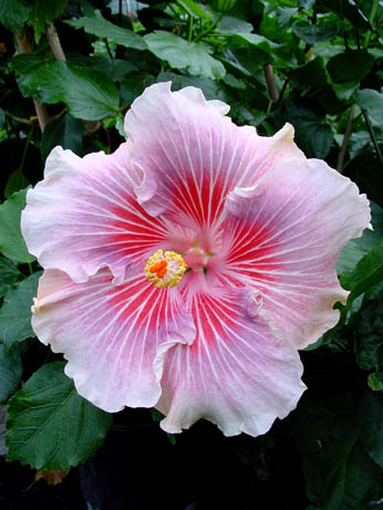 Kleur : wit/rood met grijs/blauwe rand Bloemvorm : enkel Bloemgrootte : 20 cm Familie : Malvaceae Standplaats : Zon Overwinteringstemperatuur : 15 °C Bloeiperiode : April-november Opmerkingen : -