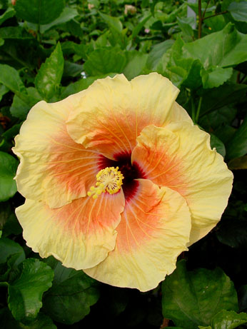 Kleur : oranje met gele rand en rood oog Bloemvorm : enkel Bloemgrootte : 16 cm Familie : Malvaceae Standplaats : Zon Overwinteringstemperatuur : 15 °C Bloeiperiode : April-november Opmerkingen : -