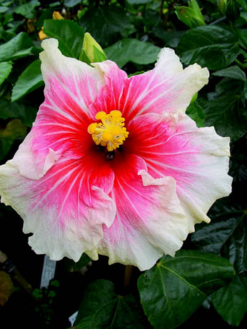 Kleur : rose met witte rand Bloemvorm : enkel Bloemgrootte : 16 cm Familie : Malvaceae Standplaats : Zon Overwinteringstemperatuur : 15 °C Bloeiperiode : April-november Opmerkingen : -