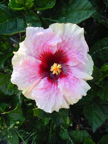 Kleur : wit/rose donkerrood oog Bloemvorm : enkel Bloemgrootte : 20 cm Familie : Malvaceae Standplaats : Zon Overwinteringstemperatuur : 15 °C Bloeiperiode : April-november Opmerkingen : -