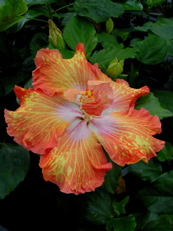 Kleur : oranje/geel gevlamd Bloemvorm : halfdubbel Bloemgrootte : 21 cm Familie : Malvaceae Standplaats : Zon Overwinteringstemperatuur : 15 °C Bloeiperiode : April-november Opmerkingen : -