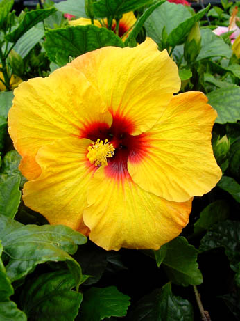 Kleur : geel met rood oog Bloemvorm : enkel Bloemgrootte : 20 cm Familie : Malvaceae Standplaats : Zon Overwinteringstemperatuur : 15 °C Bloeiperiode : April-november Opmerkingen : -