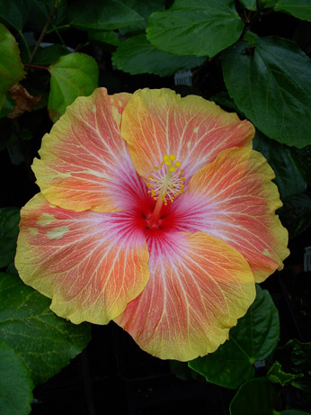 Kleur : oranje/geel gevlamd Bloemvorm : enkel Bloemgrootte : 20 cm Familie : Malvaceae Standplaats : Zon Overwinteringstemperatuur : 15 °C Bloeiperiode : April-november Opmerkingen : -
