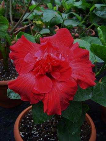Kleur : donker warm rood Bloemvorm : dubbel Bloemgrootte : 18 cm Familie : Malvaceae Standplaats : Zon Overwinteringstemperatuur : 15 °C Bloeiperiode : April-november Opmerkingen : -