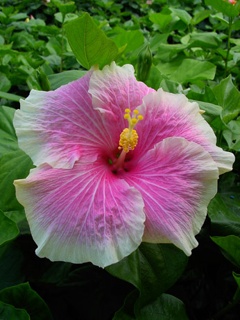 Kleur : rose met witte rand Bloemvorm : enkel Bloemgrootte : 22 cm Familie : Malvaceae Standplaats : Zon Overwinteringstemperatuur : 15 °C Bloeiperiode : April-november Opmerkingen : -