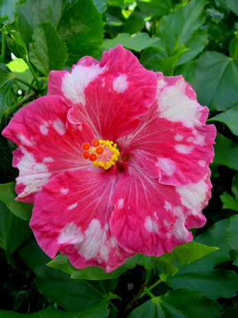 Kleur : rose met witte vlekken Bloemvorm : enkel Bloemgrootte : 14 cm Familie : Malvaceae Standplaats : Zon Overwinteringstemperatuur : 15 °C Bloeiperiode : April-november Opmerkingen : -