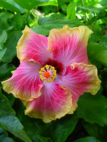 Kleur : rose met gele rand Bloemvorm : enkel Bloemgrootte : 18 cm Familie : Malvaceae Standplaats : Zon Overwinteringstemperatuur : 15 °C Bloeiperiode : April-november Opmerkingen : -