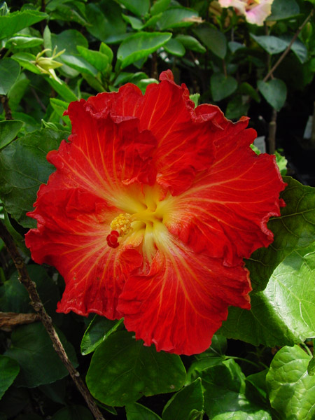 Kleur : rood/geel gevlamd Bloemvorm : enkel Bloemgrootte : 14 cm Familie : Malvaceae Standplaats : Zon Overwinteringstemperatuur : 15 °C Bloeiperiode : April-november Opmerkingen : -