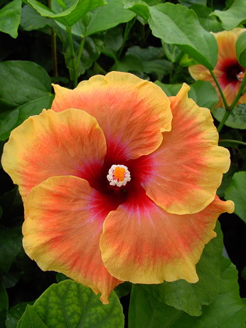 Kleur : oranje met gele rand en rood oog Bloemvorm : enkel Bloemgrootte : 16 cm Familie : Malvaceae Standplaats : Zon Overwinteringstemperatuur : 15 °C Bloeiperiode : April-november Opmerkingen : -
