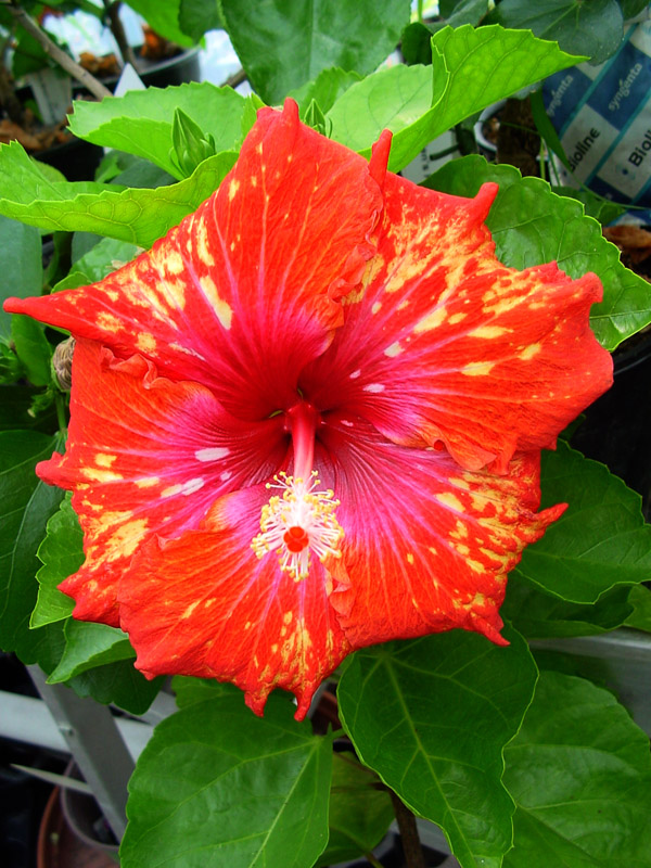 Kleur : rood/geel gevlamd Bloemvorm : enkel Bloemgrootte : 23 cm Familie : Malvaceae Standplaats : Zon Overwinteringstemperatuur : 15 °C Bloeiperiode : April-november Opmerkingen : -