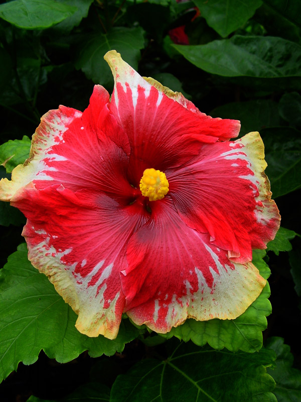 Kleur : rood met witte vlekken Bloemvorm : enkel Bloemgrootte : 22 cm Familie : Malvaceae Standplaats : Zon Overwinteringstemperatuur : 15 °C Bloeiperiode : April-november Opmerkingen : -