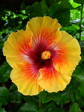 Kleur : oranje met gele rand en donker oog Bloemvorm : halfdubbel Bloemgrootte : 23 cm Familie : Malvaceae Standplaats : Zon Overwinteringstemperatuur : 15 °C Bloeiperiode : April-november Opmerkingen : -