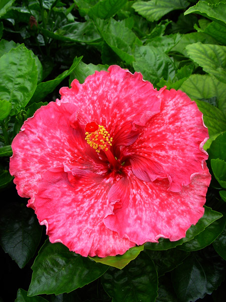 Kleur : rood met witte vlekken Bloemvorm : enkel Bloemgrootte : 18 cm Familie : Malvaceae Standplaats : Zon Overwinteringstemperatuur : 15 °C Bloeiperiode : April-november Opmerkingen : -