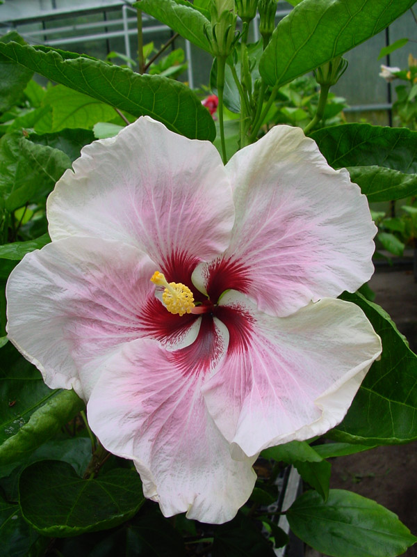 Kleur : wit met rood oog Bloemvorm : enkel Bloemgrootte : 19 cm Familie : Malvaceae Standplaats : Zon Overwinteringstemperatuur : 15 °C Bloeiperiode : April-november Opmerkingen : -