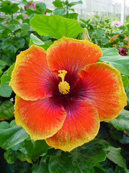 Kleur : oranje met gele rand en donker oog Bloemvorm : enkel Bloemgrootte : 19 cm Familie : Malvaceae Standplaats : Zon Overwinteringstemperatuur : 15 °C Bloeiperiode : April-november Opmerkingen : -