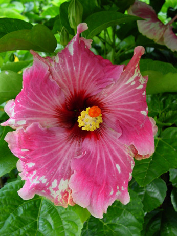 Kleur : rose met witte vlekken Bloemvorm : enkel Bloemgrootte : 18 cm Familie : Malvaceae Standplaats : Zon Overwinteringstemperatuur : 15 °C Bloeiperiode : April-november Opmerkingen : -